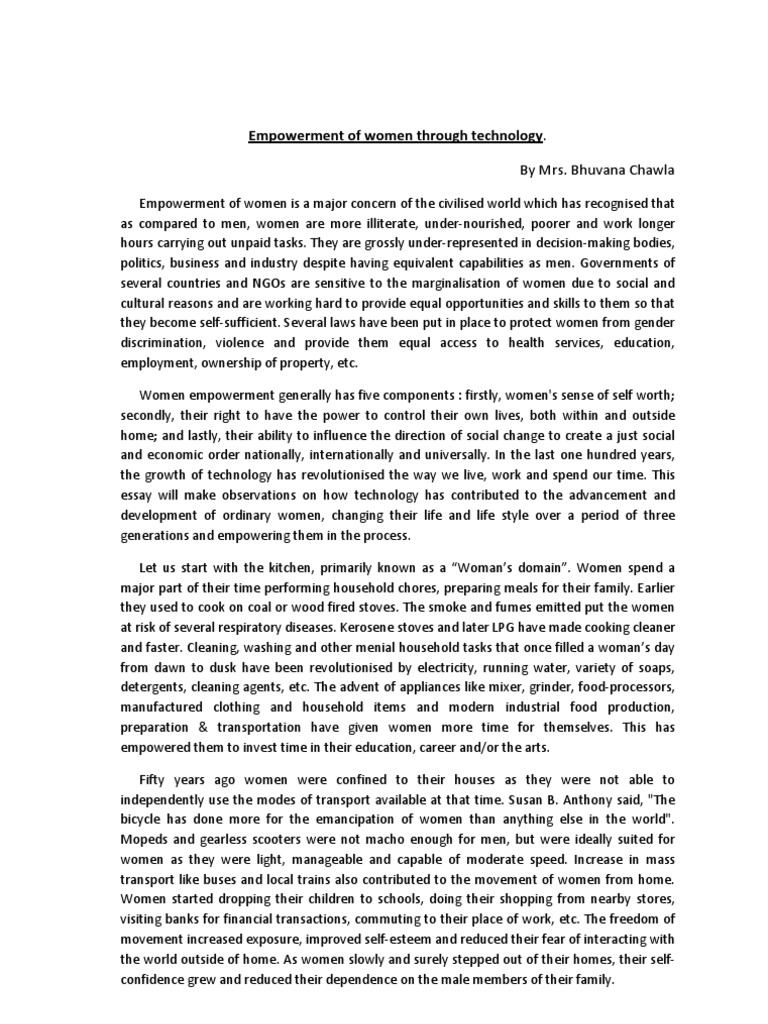 In simple terms, it entitles women to take charge of their own personal development. Since women have always been the oppressed ones in a patriarchal society, essay on women, the main motive of women empowerment is to help them stand equally with men. It is a foundational step to ensure the prosperous growth of a family as well as the country. Empowering women, the world would definitely witness gender equality and help women from every stratum of society stand on their own and steer their lives as per their own wishes. Women empowerment is the process of giving women the ability essay on women live a happy and respected life in society.